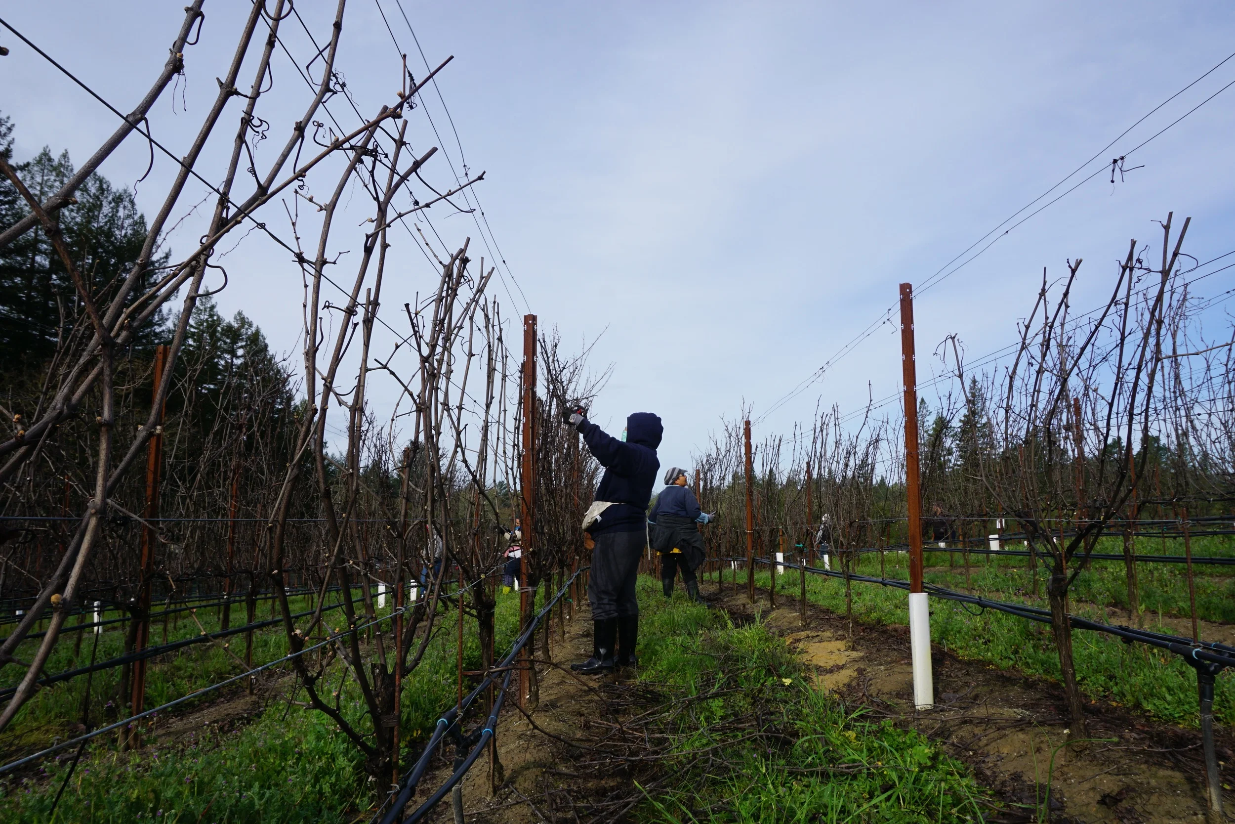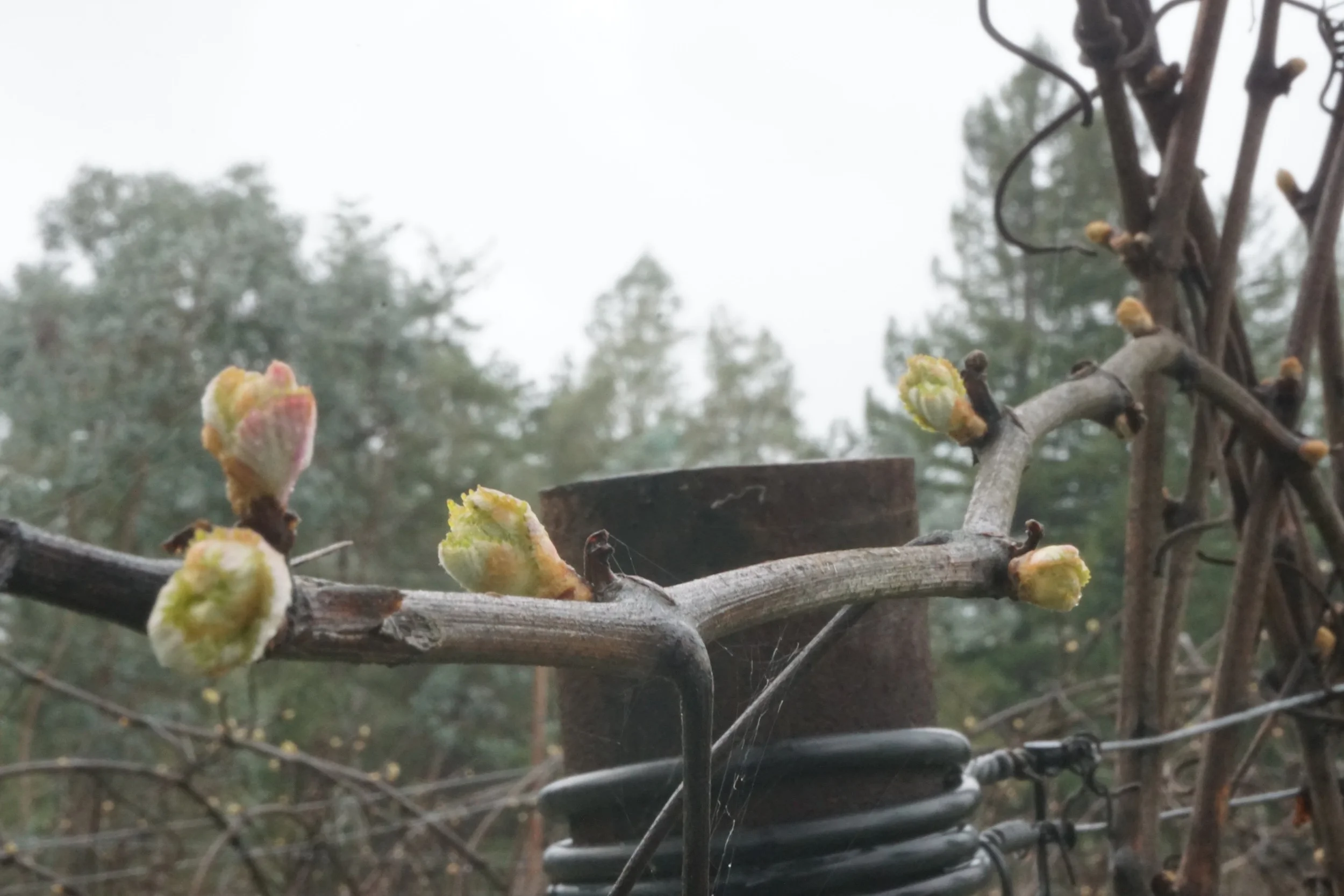 Because there’s always a chance of frost in March, pruning as late as we do can actually slow down bud break as it releases water pressure from inside the vine. A frost can kill brand-new open buds, leaving us fewer shoots that grow fruit.