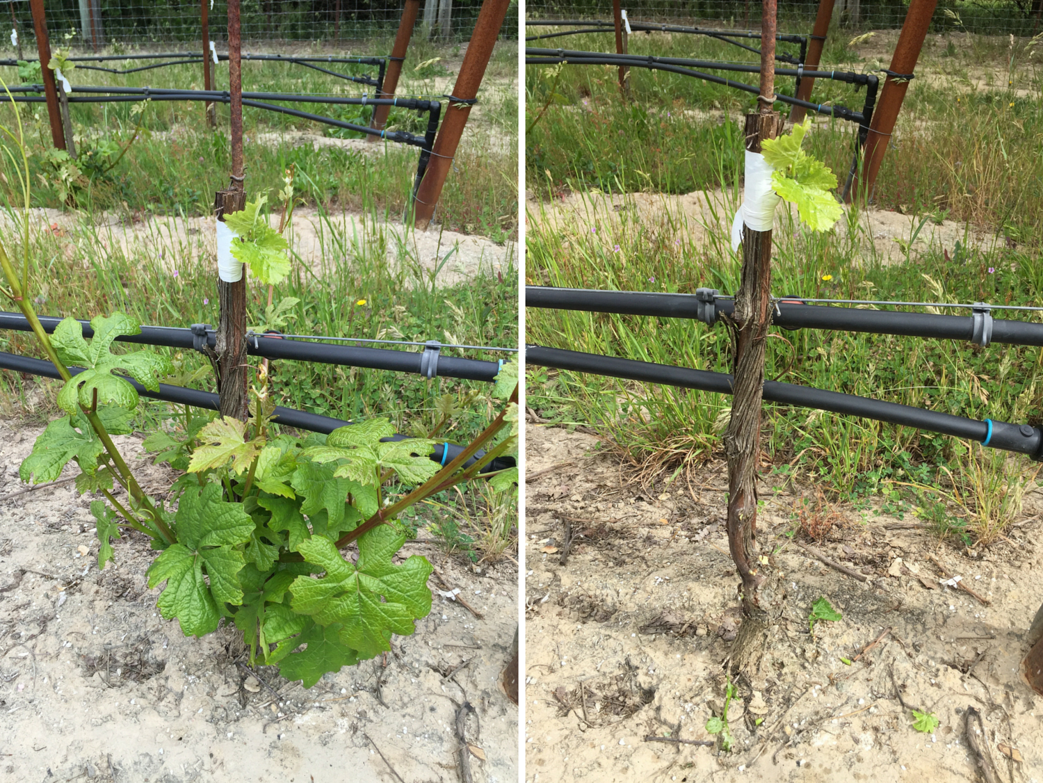 The new buds on the Mariafeld are breaking nicely. But the root stock -- which the Mariafeld clone is grafted to to create a phylloxera-resistant base -- is putting out a lot of suckers. These suckers steal energy necessary for the survival of the little buds, so it’s our job to remove them.
